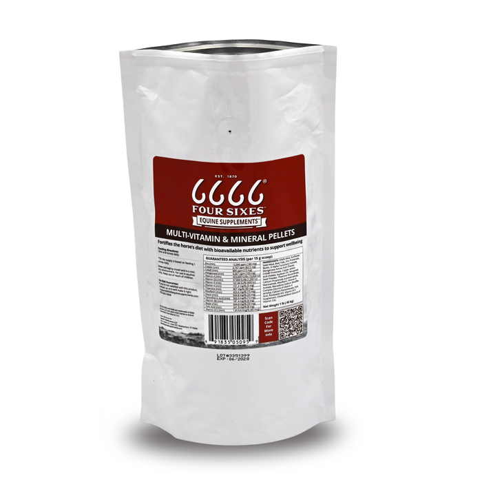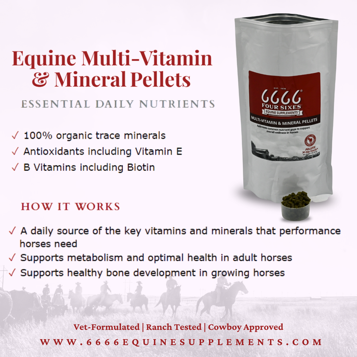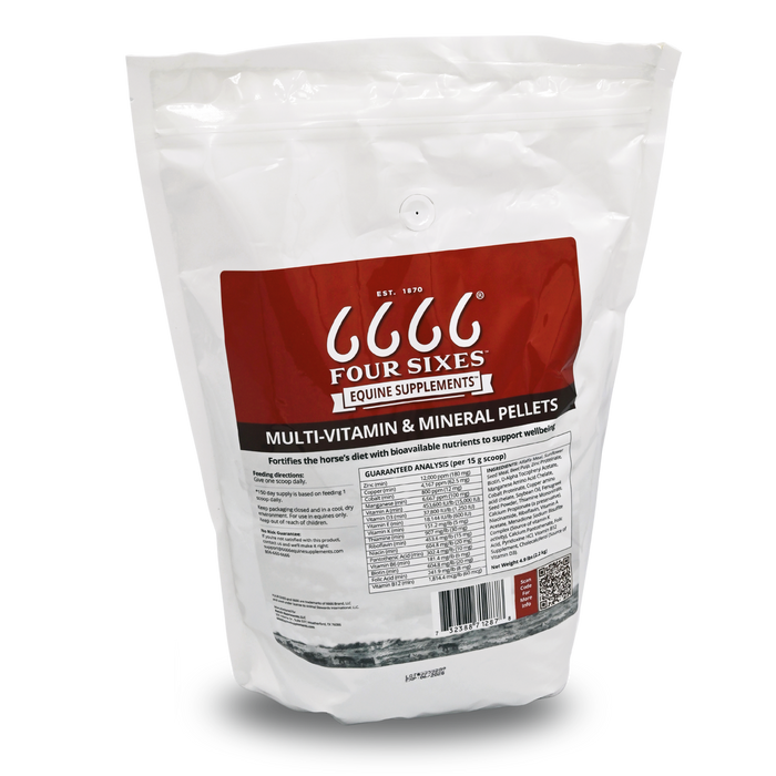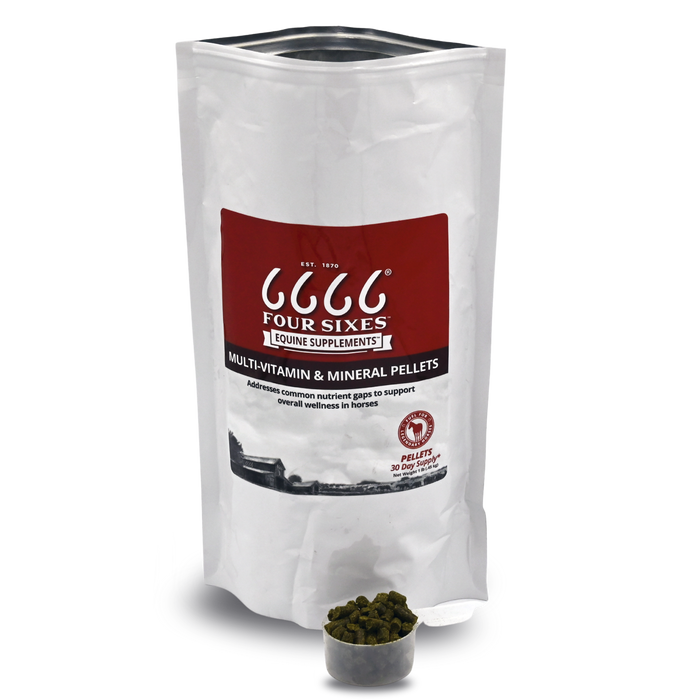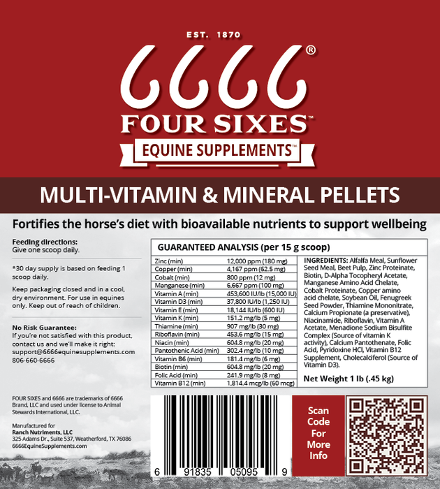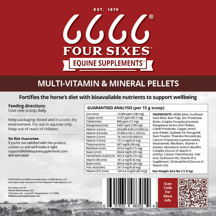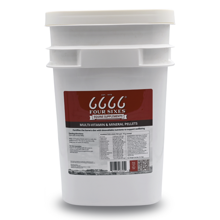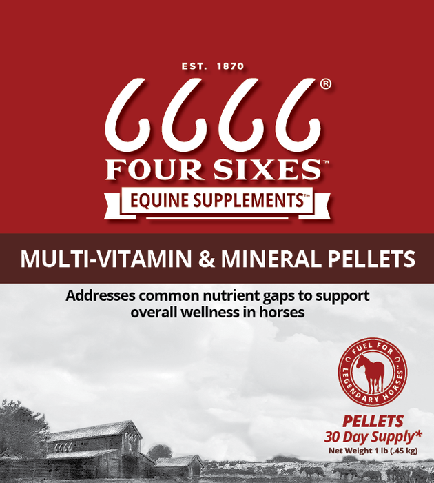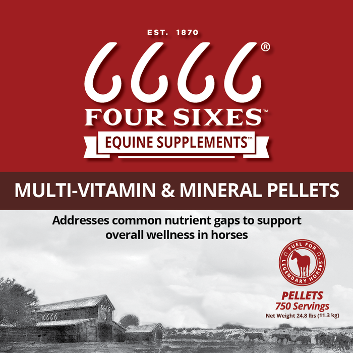 An equine vitamin/mineral supplement is only as good as the quality, quantity, source, and balance of the nutrients it provides. The Four Sixes Multi-Vitamin/Mineral supplement was formulated by veterinarians and a PhD equine nutritionist. This ranch-trusted product provides horses with the correct balance of vitamins and minerals, and includes the most bioavailable and efficacious nutrient sources backed by research.
