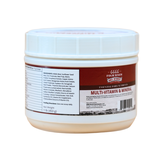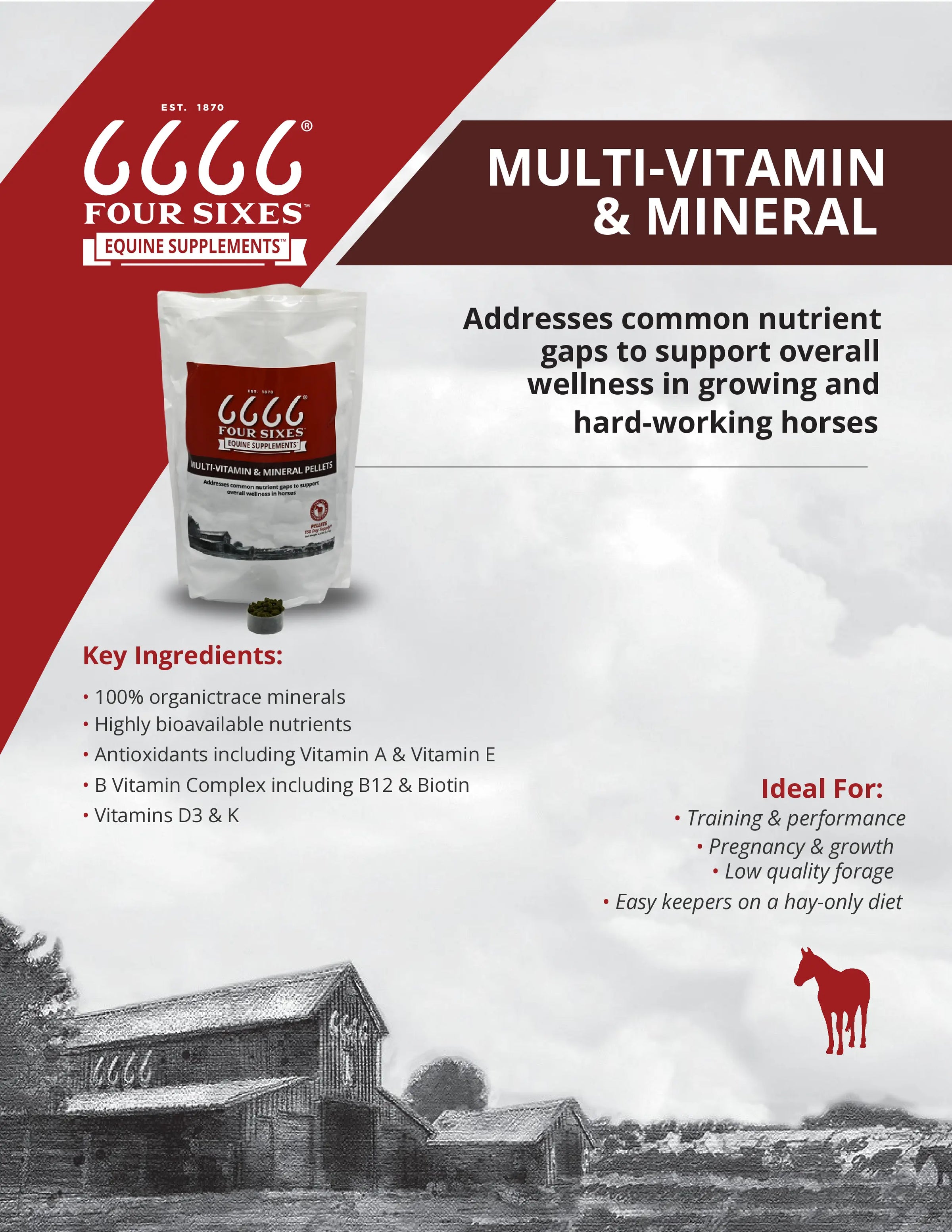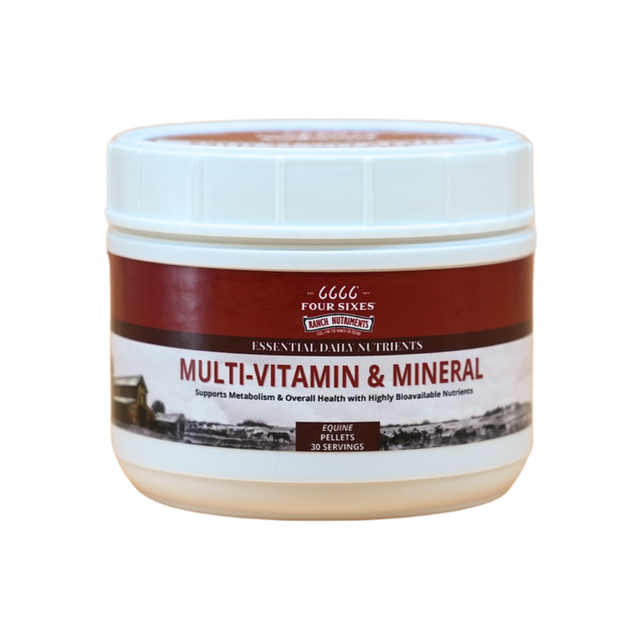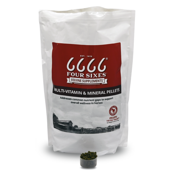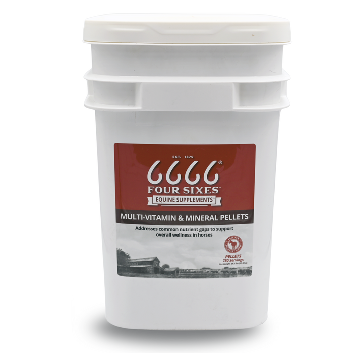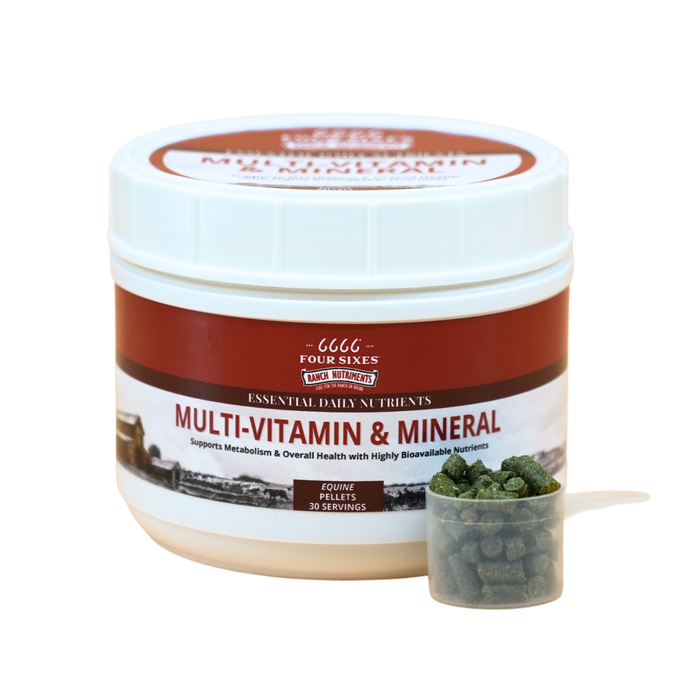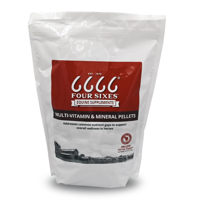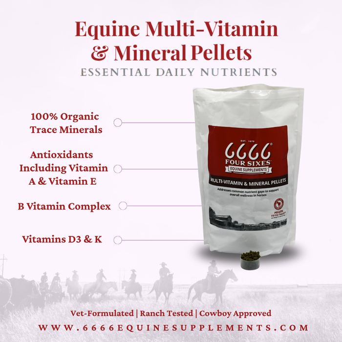 An equine vitamin/mineral supplement is only as good as the quality, quantity, source, and balance of the nutrients it provides. The Four Sixes Multi-Vitamin/Mineral supplement was formulated by veterinarians and a PhD equine nutritionist. This ranch-trusted product provides horses with the correct balance of vitamins and minerals, and includes the most bioavailable and efficacious nutrient sources backed by research.