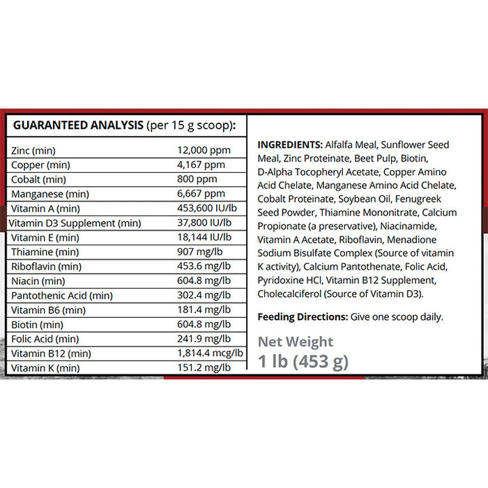 Because of the nutritional demand on hard-working performance horses, the addition of a multi-vitamin and multi-mineral supplement can fortify the diet with important nutrients.