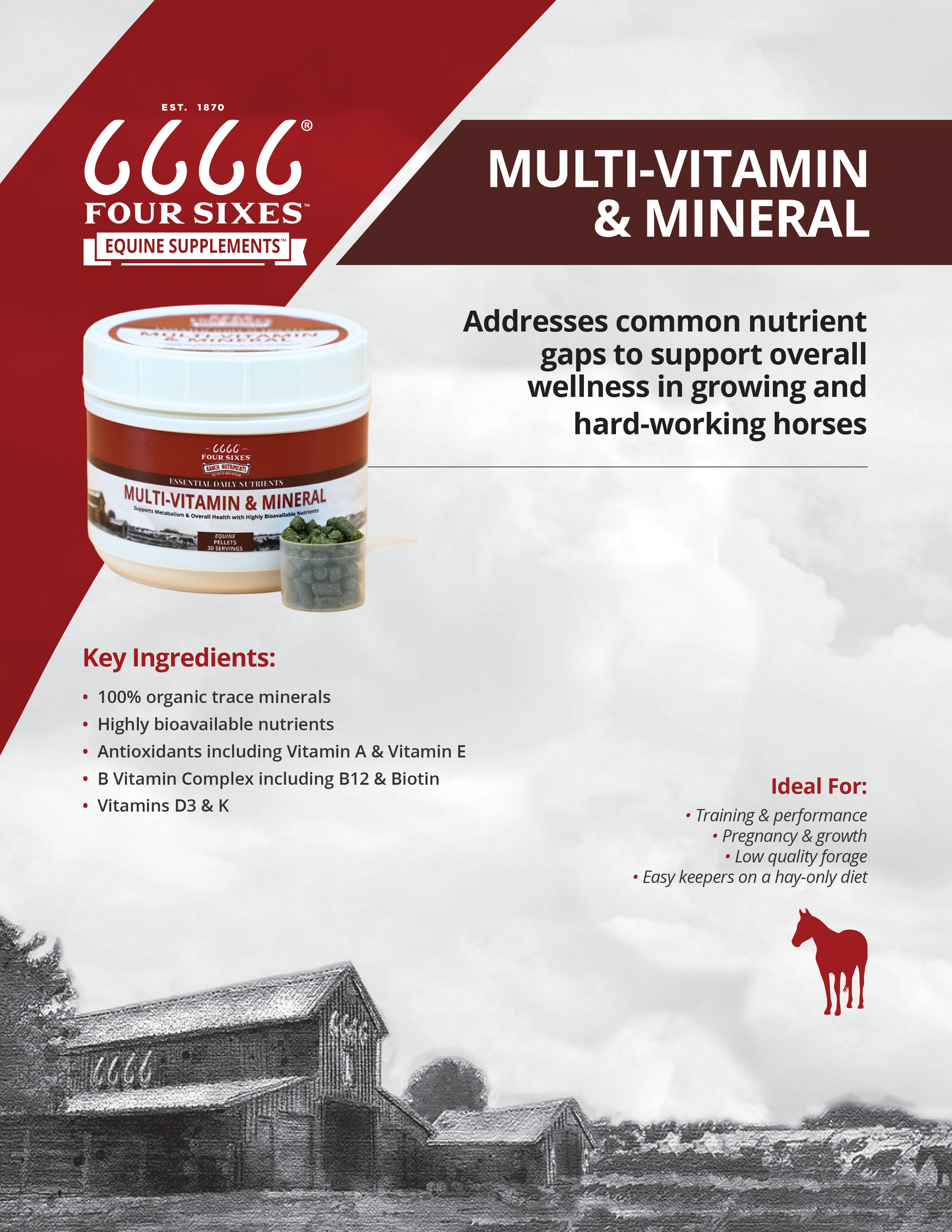 An equine vitamin/mineral supplement is only as good as the quality, quantity, source, and balance of the nutrients it provides. The Four Sixes Multi-Vitamin/Mineral supplement was formulated by veterinarians and a PhD equine nutritionist. This ranch-trusted product provides horses with the correct balance of vitamins and minerals, and includes the most bioavailable and efficacious nutrient sources backed by research.